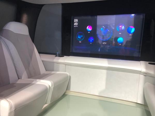无人车的车窗十分特别,它可以通过Pad上的操作完成玻璃和屏幕的转换。当你想看窗外风景时,它和普通车窗没什么两样;当你想娱乐时,车窗秒变屏幕,你就可以在车里唱KTV、玩游戏、看电影了!工作人员说,无人车使用的特殊“玻璃”是由合作方松下供应商提供的。