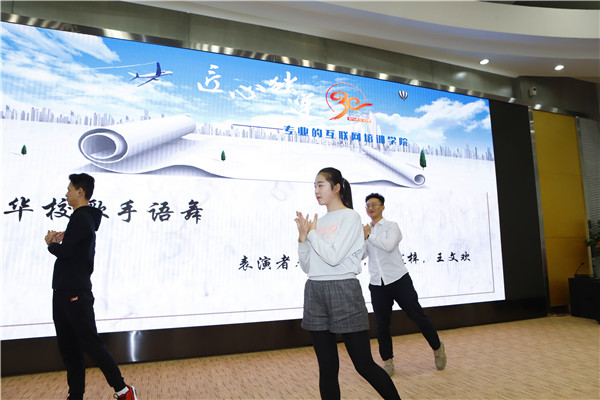 首先,学生会的同学们给大家带来“新华校歌手语舞”,表达了青年学生积极向上,迎接未来的美好夙愿。